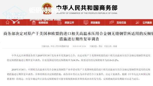 商務(wù)部關(guān)于調(diào)整原產(chǎn)于美國和歐盟的進(jìn)口相關(guān)高溫承壓用合金鋼無縫鋼管所適用的反傾銷稅率的公告 > 2014年5月9日,商務(wù)部發(fā)布2014年第34號公告,決定自2014年5月10日起,對原產(chǎn)于美國和